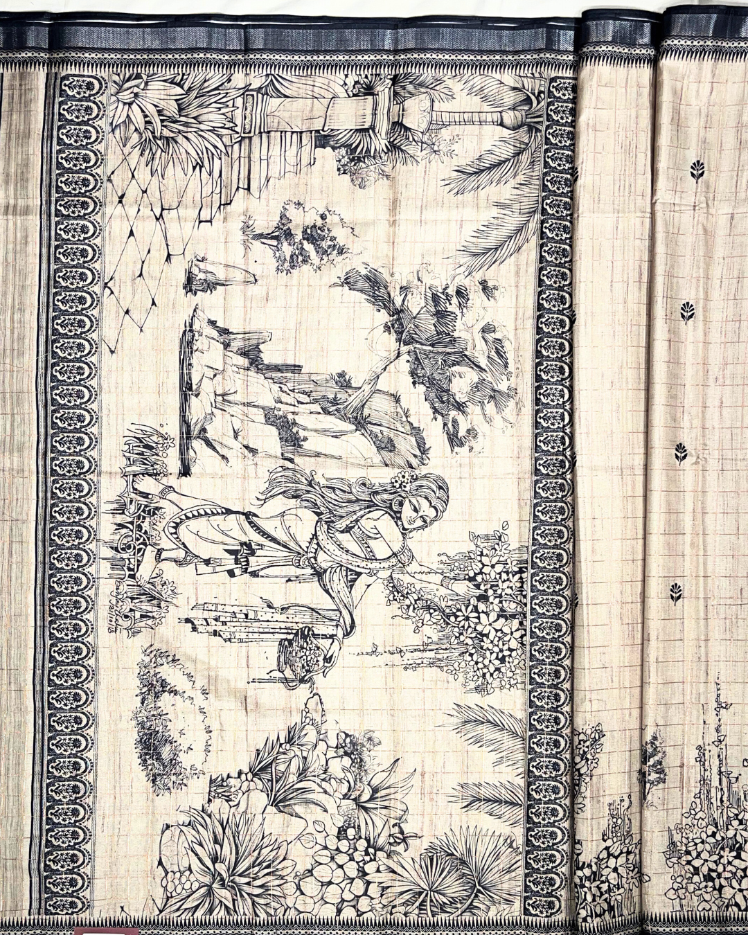 Elegant beige khadi saree with intricate black block prints showcasing traditional motifs – lightweight, timeless, and perfect for festive, office,...