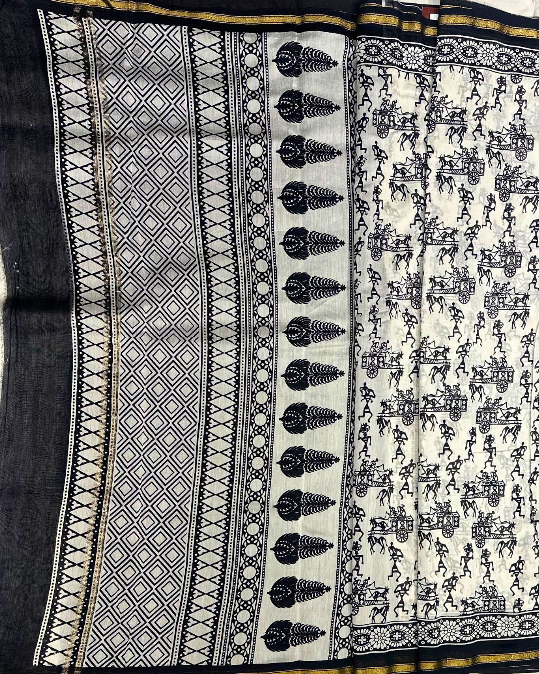 Elegant Chanderi cotton saree featuring traditional Warli prints, showcasing lightweight handloom craftsmanship, perfect for festive and casual occasions.