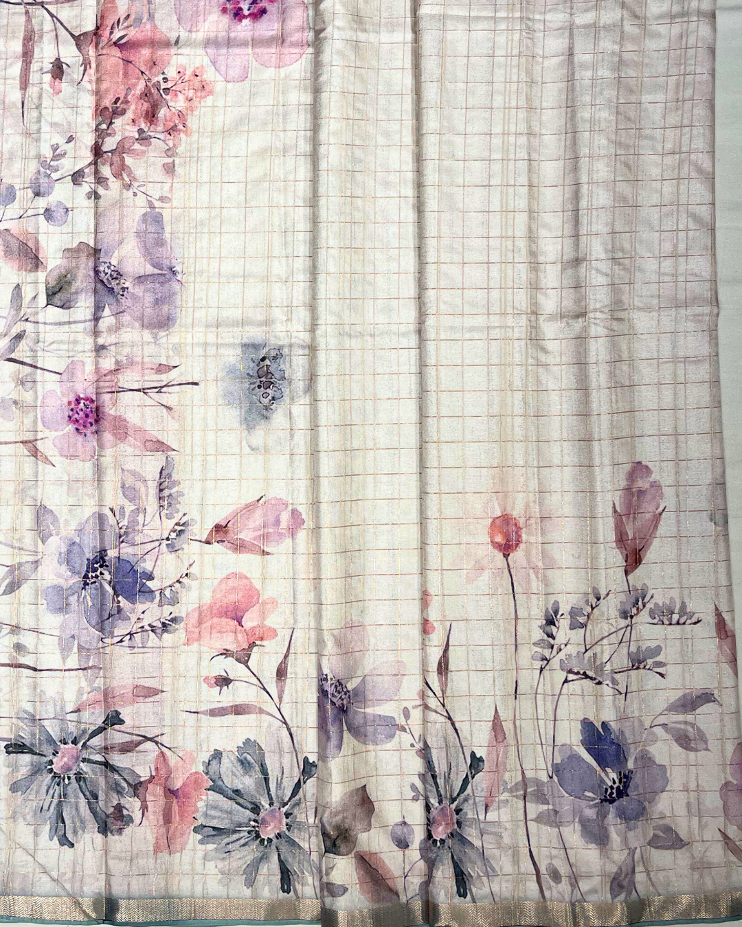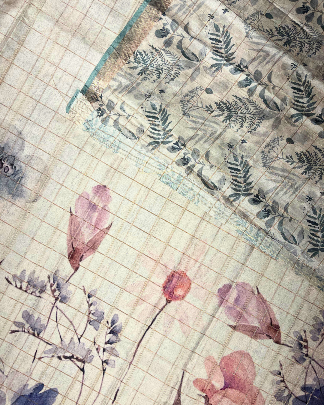 Cream khadi saree with soft pastel watercolor floral prints and subtle checked weave—lightweight, breathable, and perfect for office, daytime events,...