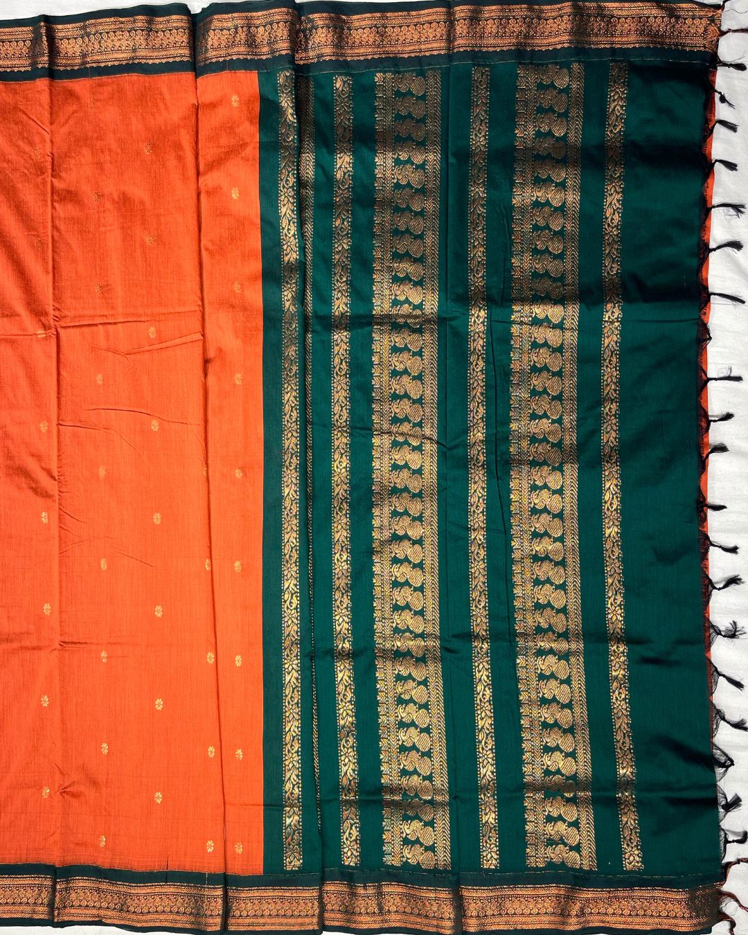 Handwoven Gadwal Cotton Saree with rich borders and elegant motifs, perfect ethnic wear for weddings, festivals, and cultural occasions.