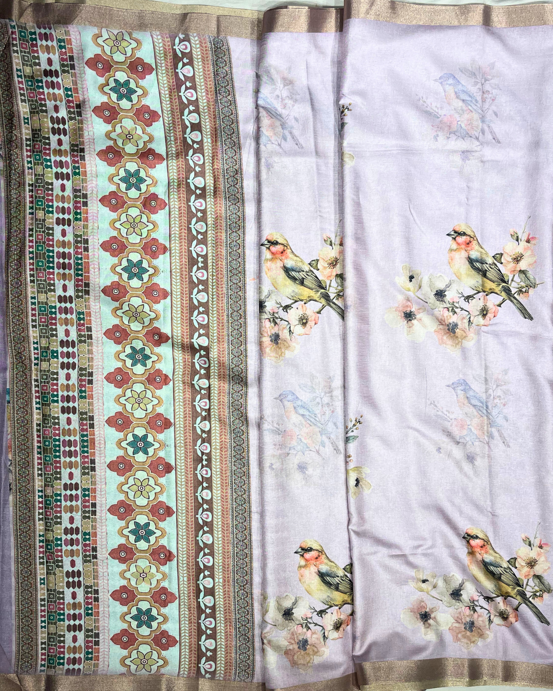 Unique khadi saree featuring pastel floral motifs with delicate bird print, complemented by a woven handloom border, perfect for festive...