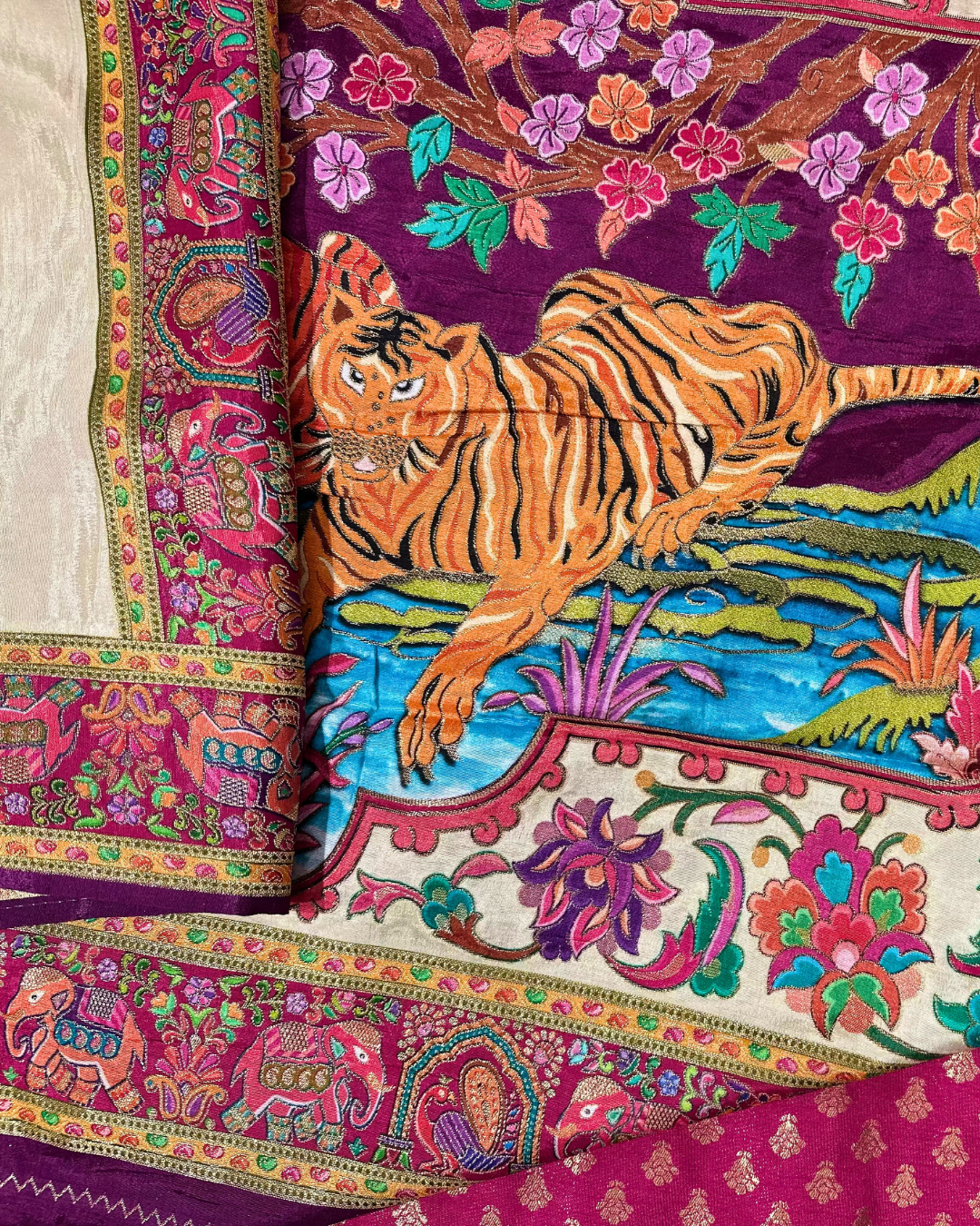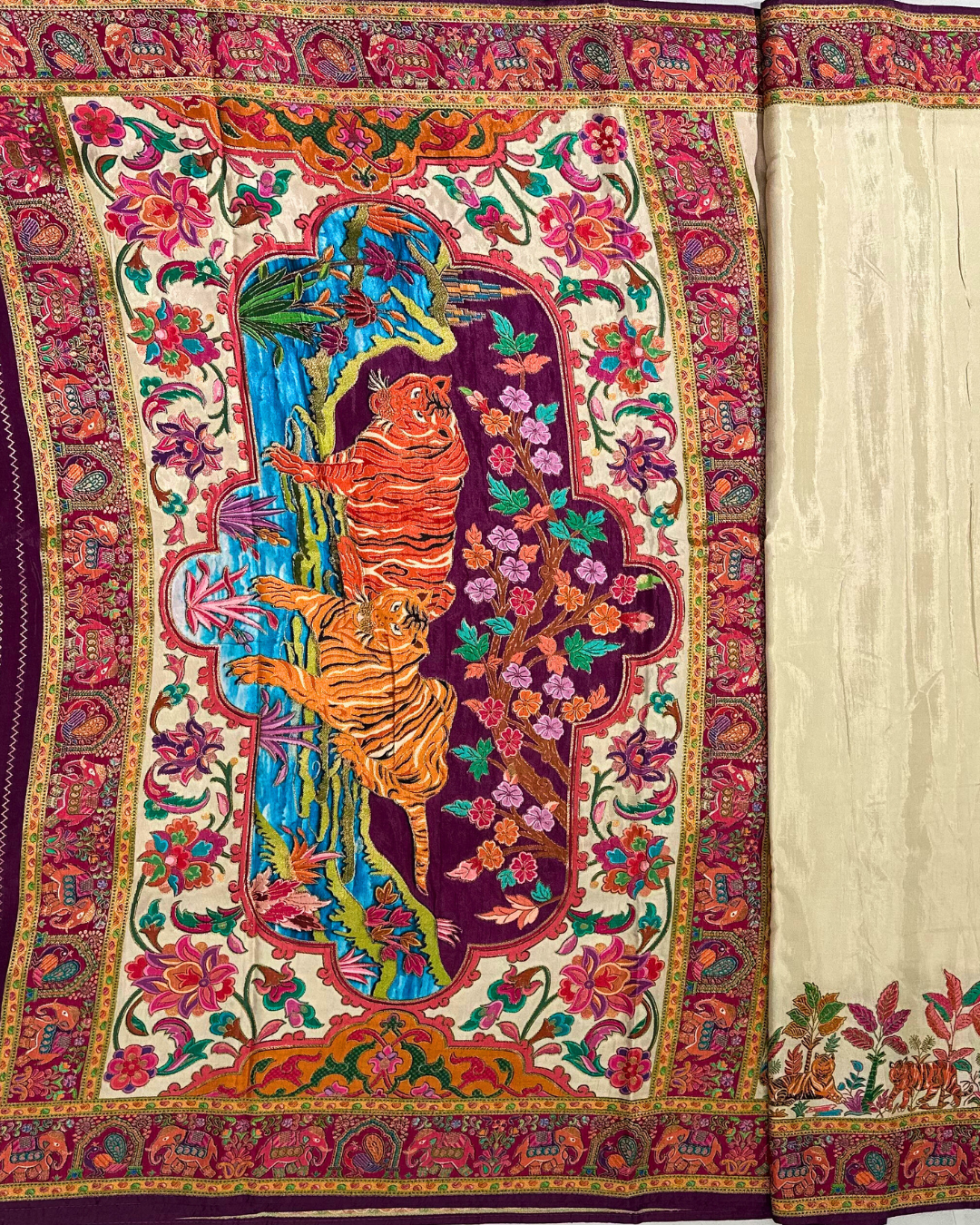 Exquisite pearl-white Pashmina silk saree featuring intricate multicolored resham panels with narrative tiger and floral motifs and an ornate woven...