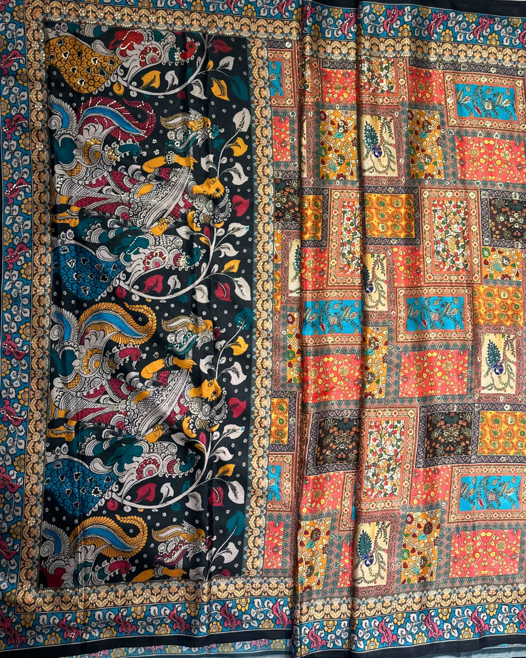 Elegant satin crepe saree featuring vibrant Kalamkari-inspired motifs and intricate border detailing — perfect for festive & ethnic occasions.