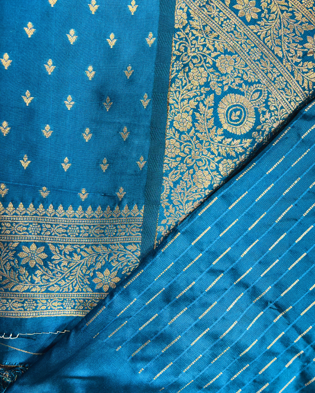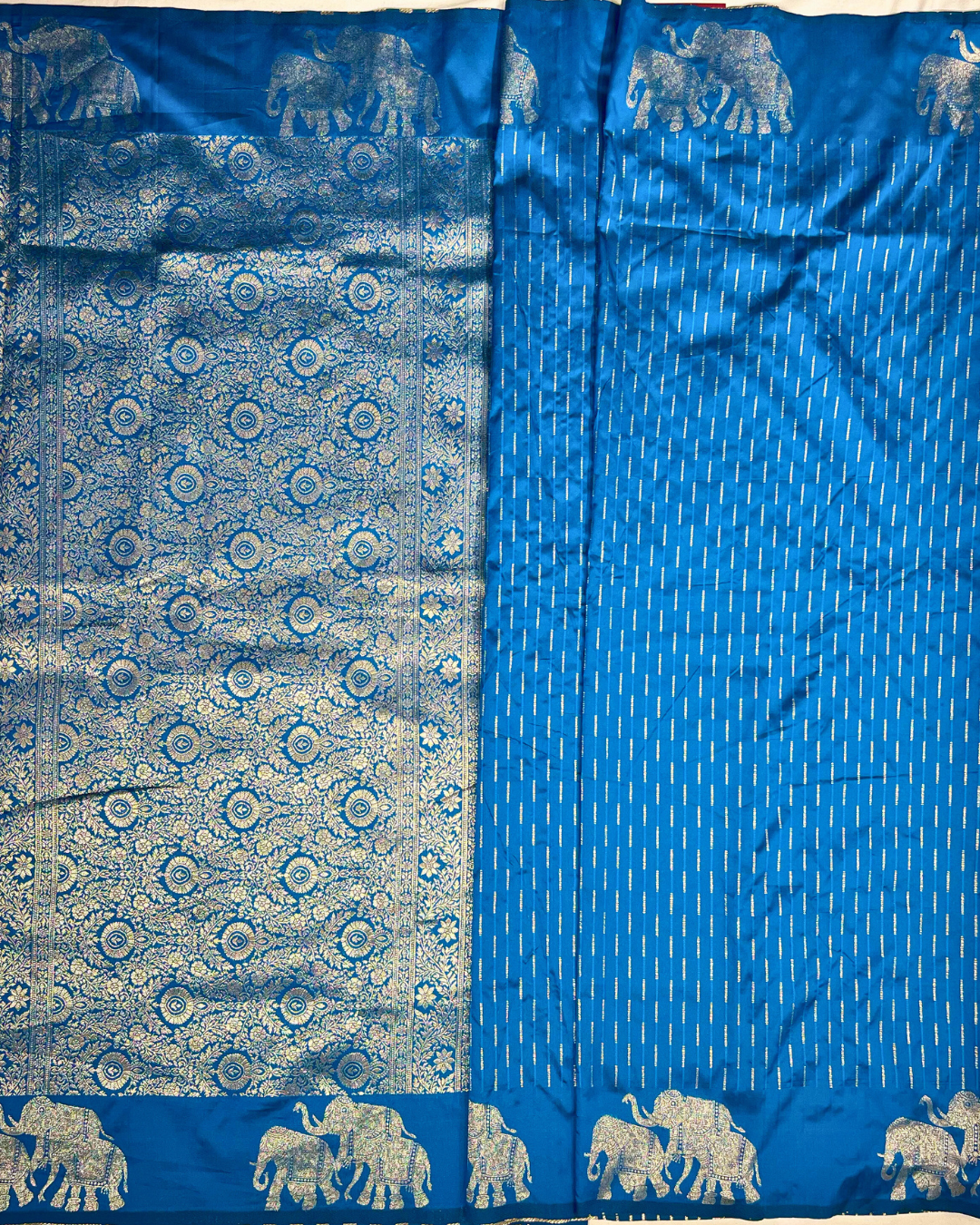 Grace meets tradition with our Soft Silk Borderless Saree in a striking bluish shade, adorned with an elegant elephant motif...