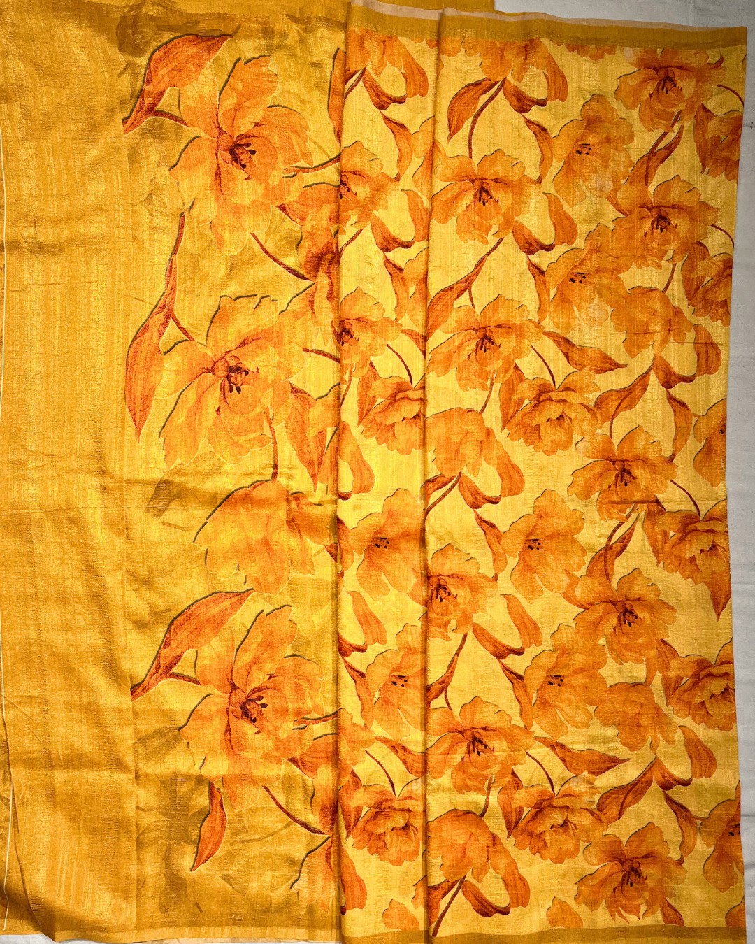 Yellow Khadi Floral Print Saree – Elegant Handwoven Ethnic Wear
